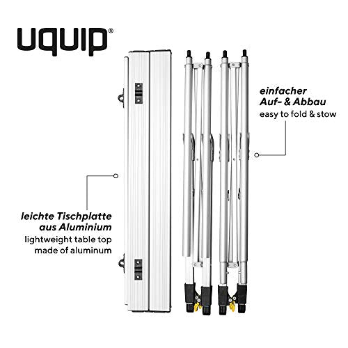 De esta manera, »Variety« de Uquip se adapta a su alturaCaracterísticas del producto: ideal para max. Gracias al espacio mínimo entre los rollos, la mesa ofrece un tablero continuo y, por lo tanto, la posibilidad de colocar facilmente vasos sobre la masa sin ningún riesgo. Mesa enrollable de camping Variety M Uquip - Berger Camping - Accesorios de camping Mesa Plegable Camping Hengda Mesa De Camping Plegable De Aluminio, 91 X 50 Cm, Altura Mesa Camping Plegable Construcción de aluminio resistente a la intemperie, fácil de desplegar, resistente, ligera. Mesa versátil adecuada para día festivo, playa, viajes en autocaravana, jardín, barbacoa o picnic La mesa está provista de dos elementos muy robustos: la estructura de aluminio y el tablero de aluminio enrollable. Gran mesa de camping de aluminio con placa rodante u2013 extra fácil + extra estable hasta 100 kg de carga, gracias a su especial marco de aluminio · Formato óptimo... La mesa plegable »Variety« de UQUIP es fácil de instalar, estable y ligera Dimensiones mesa montada Tableo de la mesa: 120 x 70 cm Altura regulable: 46 - 70,5 cm Peso: solo 6,2 KgLas patas de la mesa son regulables en altura Independientemente de si lo coloca sobre una superficie irregular o si simplemente quiere darles a sus hijos la oportunidad de sentarse correctamente. La mesa es ideal para max. 6 personas. Las patas de la mesa son regulables en altura y ofrecen un soporte adaptable y seguro también sobre superficies irregulares.